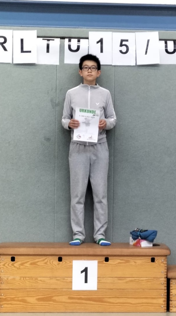 Weiter ging es mit dem Jungeneinzel, welches Leo in der U15 bestritt: Hier war er an Position 1 gesetzt und sollte diesem Setzplatz auch gerecht werden! Ohne große Mühe gewann er die erste Runde gegen Ole Finck (Zwenkau), ebenso das Viertelfinale gegen den an Position 8 gesetzten Till Besser aus Gera. Auch das Halbfinale gegen Valentin Lang (Pos. 4, Altshausen) entschied Leo in zwei glatten Sätzen für sich. Im Finale am Sonntagmorgen traf er auf den Drittgesetzten Yutong He (München), der sich bis dato ebenfalls ohne Satzniederlage durchs Turnier gespielt hatte. Hier kam Leo erstmals so richtig in Bedrängnis, konnte den ersten Satz nur knapp mit 22:20 für sich entscheiden, ehe er seinem Gegner im zweiten Satz, den Sieg vor Augen, keine Chance mehr ließ. Ohne Satzverlust sicherte sich Leo damit den ersten Platz – wow!